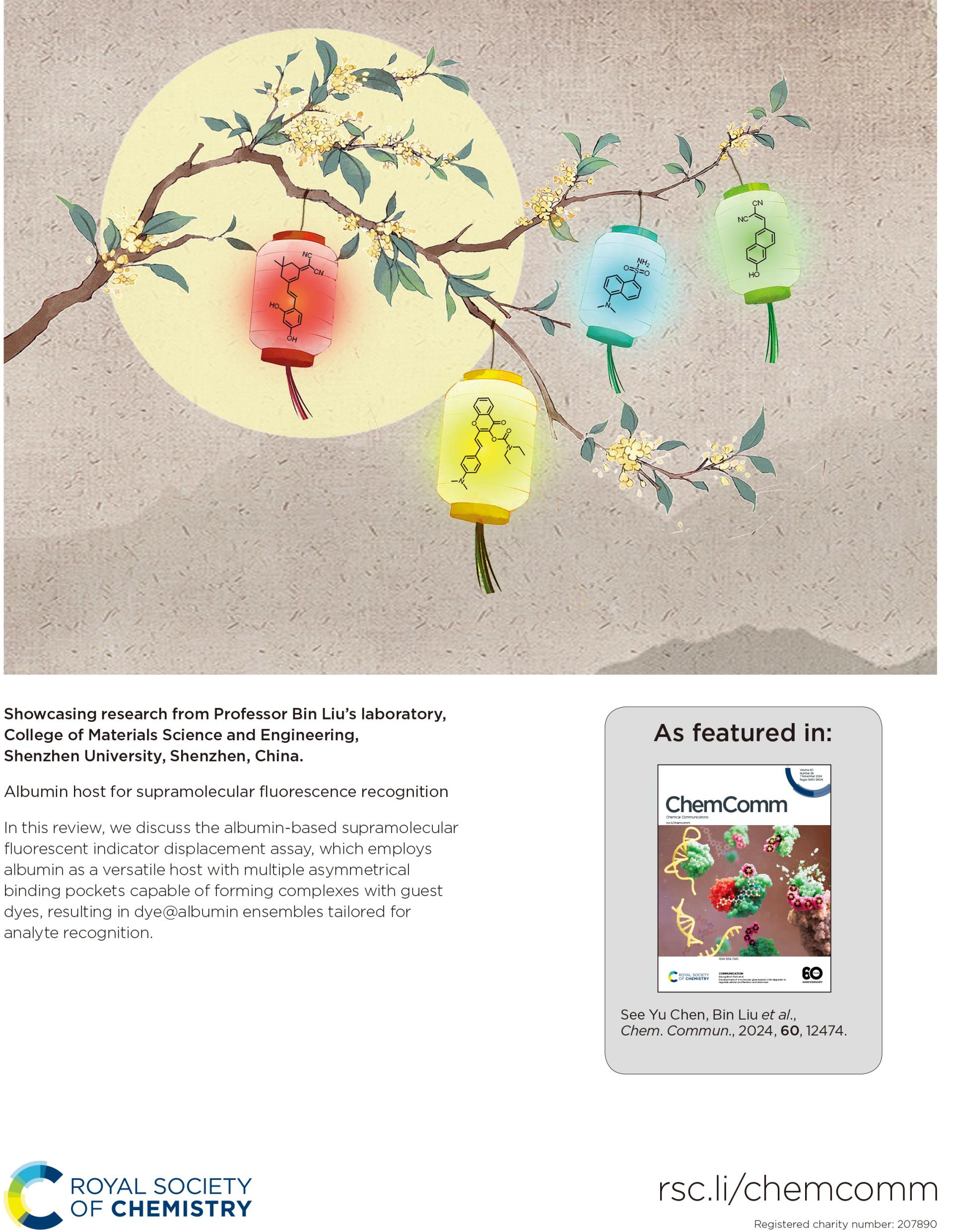 91. Zhongyong Xu, Weihua Deng, Na Li, Taoyuze Lv, Lei Wang, Xiaoqiang Chen, Mingle Li, Wenxing Zhang*, Bin Liu*, and Xiaojun Peng, Harnessing a simple ratiometric fluorescent probe for albumin recognition and beyond. Chem. Commun. 2024, 60, 6304-6307. (IF4.4, JCR2) [PDF]